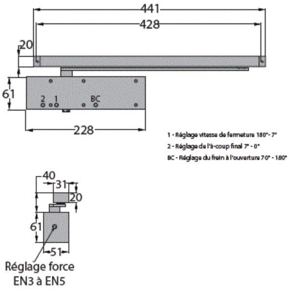 - Force 3 à 5 réglable par vérin pour des portes de 100 kg maximum, ou avec un vantail jusqu’à 1250 mm.