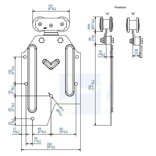 - Montures de fixation sur plat, avec deux galets en acier montés sur cage à rouleaux.