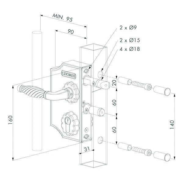 | Conditionnement | 1 serrure de portail, livrée avec béquilles doubles et cylindre, Locinox |