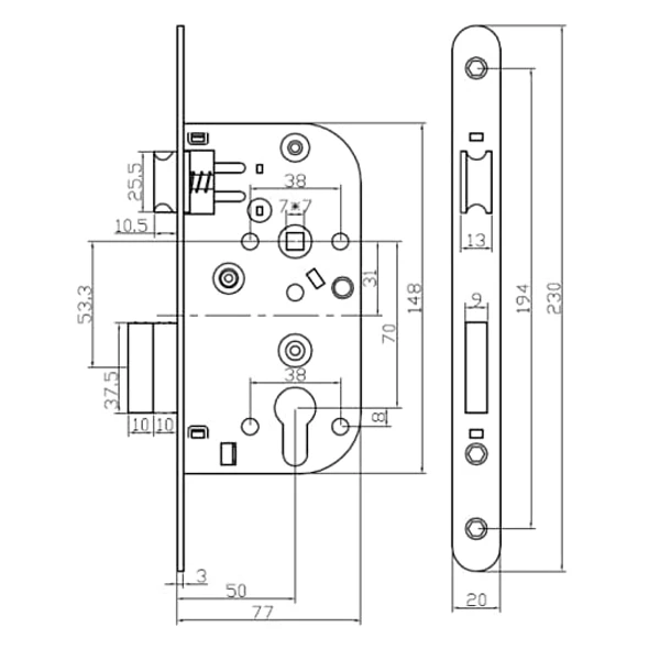 - Emplacement pour cylindre européen (non inclus) afin de verrouiller la porte.